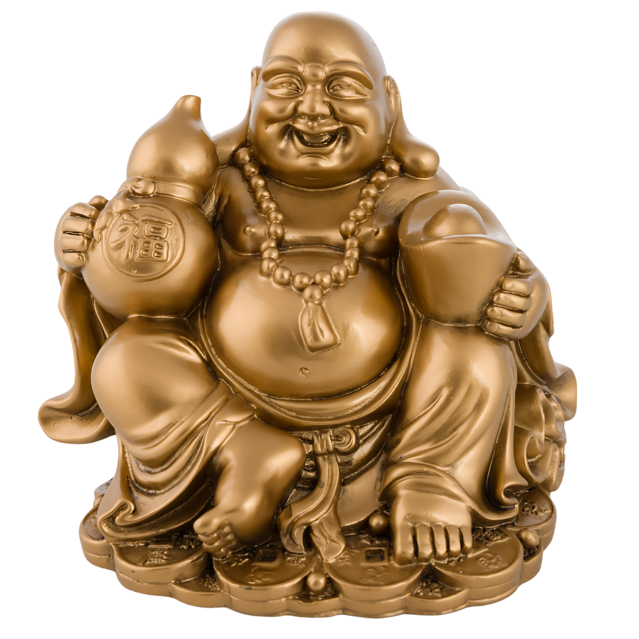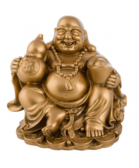 Smějící se Buddha s Wu Lou a zlatými ingoty je symbolem štěstí, hojnosti a dlouhověkosti. Přináší pozitivní energii do domova i kanceláře a podporuje prosperitu a zdraví.