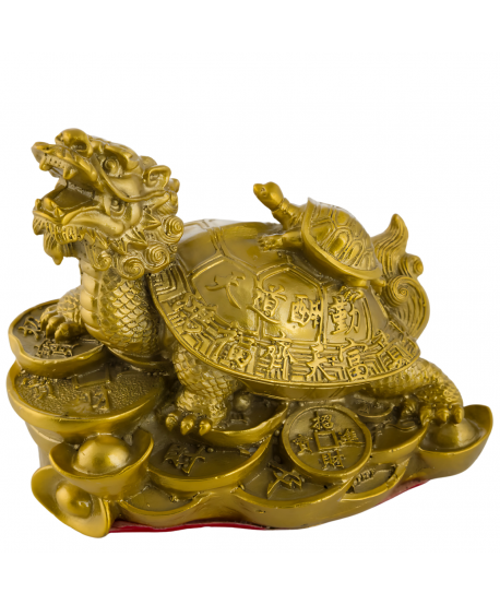 Zlatá dračí želva je symbolem štěstí, radosti a dobrých vztahů. Kombinuje moc draka (sílu a odvahu) a stabilitu želvy (dlouhověkost a ochranu). Pokud má mince pod nohama nebo v tlamě, symbolizuje navíc finanční hojnost.