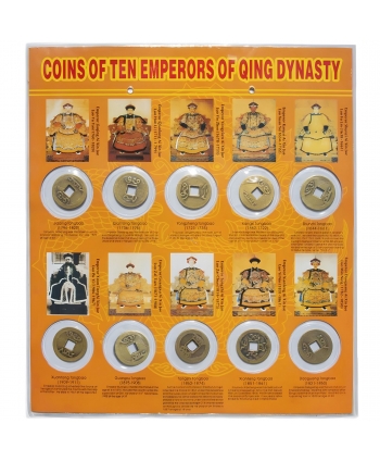 Replika historické sady mincí z období čínské dynastie Čching (1644–1911), vlády poslední císařské dynastie Číny. Sada obsahuje deset mincí, z nichž každá reprezentuje jednoho z deseti císařů – od císaře Shunzhi až po císaře Xuantonga (Pu Yi).