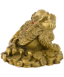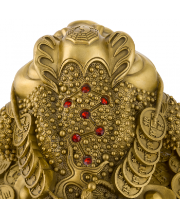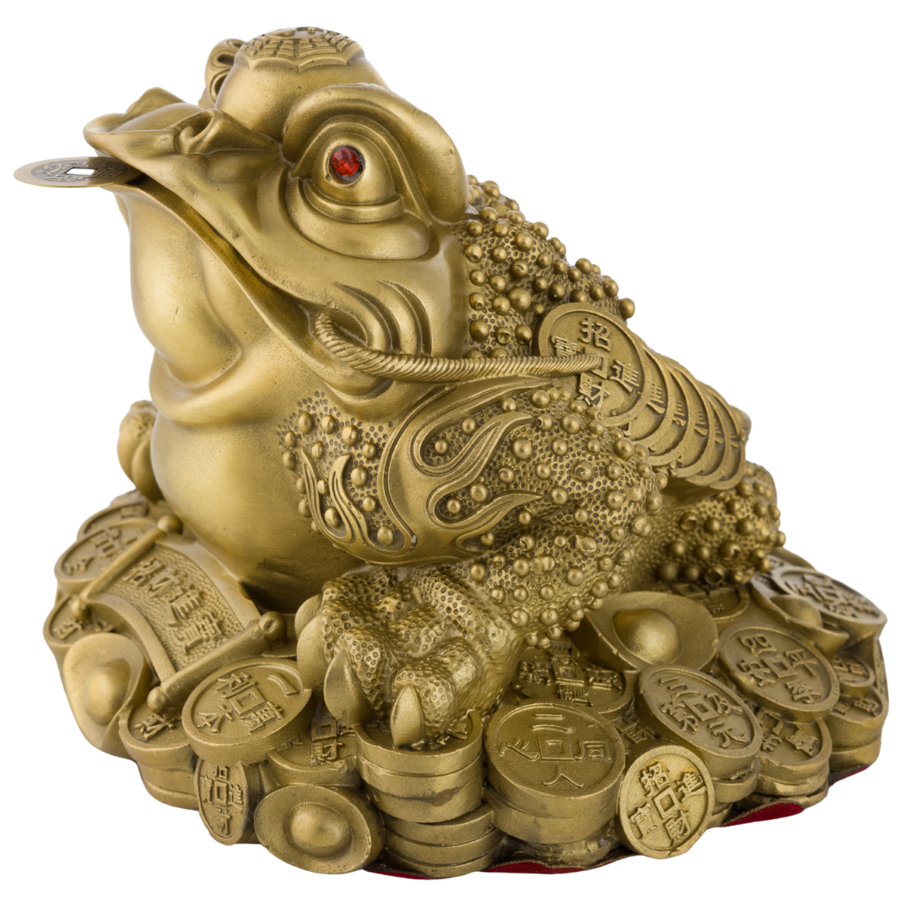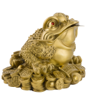 Tato impozantní XXL třínohá žába, sedící na hromadě mincí a zlatých ingotů s čínskou mincí v tlamě, je silným symbolem štěstí, prosperity a úspěchu. Podle tradiční čínské legendy přináší tento mystický tvor bohatství a finanční hojnost do každého domova, kde je umístěn.