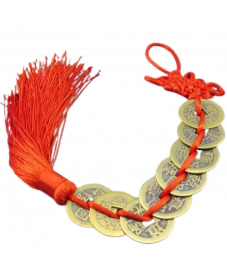 A 8 fém kínai érme végtelen piros csomóval a feng shui leggyakrabban használt szimbólumai közé tartozik, a jövő boldogságának és sikerének támogatására. Aktiválja a tudás, a tanulás északkeleti területét, ez egy megfelelő szimbólum a gyerekek számára az iskolai sikerek elősegítésére. Az érmék aktiválják az általános boldogságot a házban, felakaszthatod őket a bejárati ajtóra.