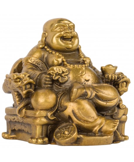 Mosadzný smejúci sa Budha na cisárovom dračom kresle s ingotom a mešcom peňazí pre šťastie a hojnosť.