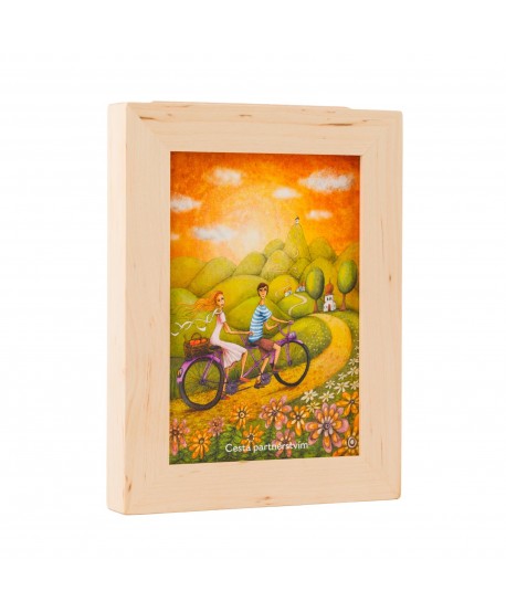 The set Journey to self contains 32 images size 12 x 17 cm. On one side of the card is an illustration with a short text, which is on the other side led into a few sentences. Cards with pictures are framed in the beautiful natural alder frame, which also serves as a box with a lid.