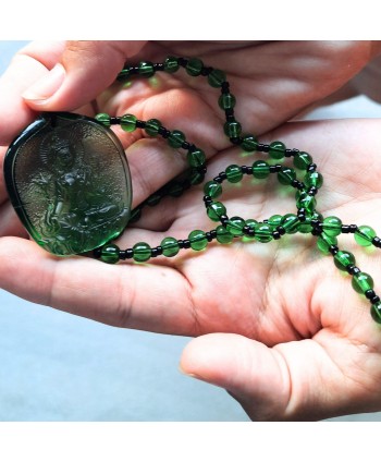 Náhrdelník zo sklenených korálikov s Tarou je jemný šperk, ktorý kombinuje krásu ručne navlečených sklenených korálikov s duchovným symbolom Tary, budhistickej bohyne súcitu a ochrany. Lesklé koráliky elegantne ladia s príveskom, ktorý predstavuje Taru, a dodávajú náhrdelníku nielen estetickú hodnotu, ale aj hlbší spirituálny význam.